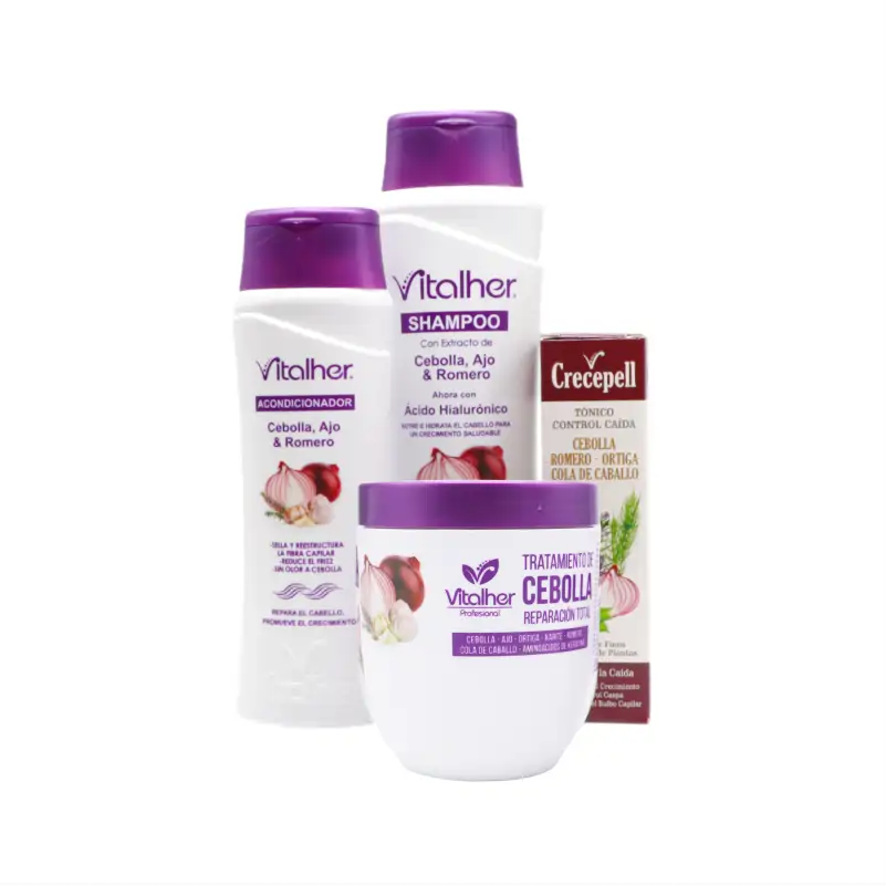En Vitalher Profesional, sabemos que es molesto pasar la mano por tu cabello y sacarla con un montón de pelo. Por esto, nuestro equipo de profesionales dedicó su atención en crear el kit de cebolla Vitalher una solución efectiva para la caída del cabello. Previamente, estudiamos cada componente de estos productos, escogiendo los mejores según sus beneficios.